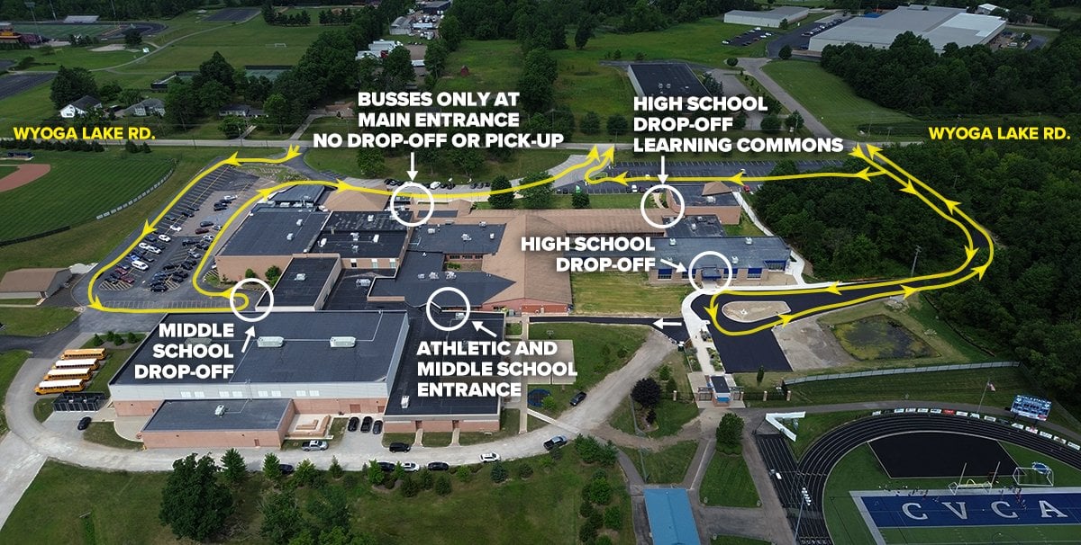 - Due to heavy traffic at the Middle School Entrance, middle school students may also utilize the high school drop-off location and enter through the Athletics side entrance.